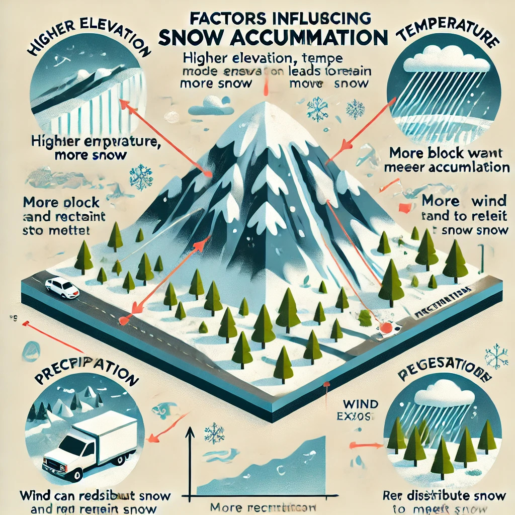 L’accumulation de la neige en montagne est déterminée par plusieurs facteurs. La quantité de neige tombée, la température et le vent jouent un rôle prépondérant. Le vent, par exemple, peut déplacer la neige, créant des accumulations de neige soufflée, susceptibles de provoquer des avalanches.